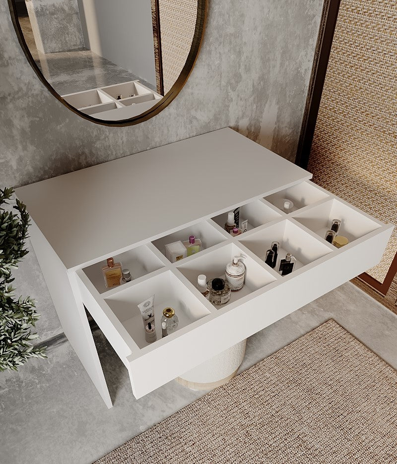 İç kısmında yer alan çok bölmeli çekmece düzeni, makyaj ürünlerinizi, parfümlerinizi ve aksesuarlarınızı düzenli bir şekilde saklamanızı sağlar.