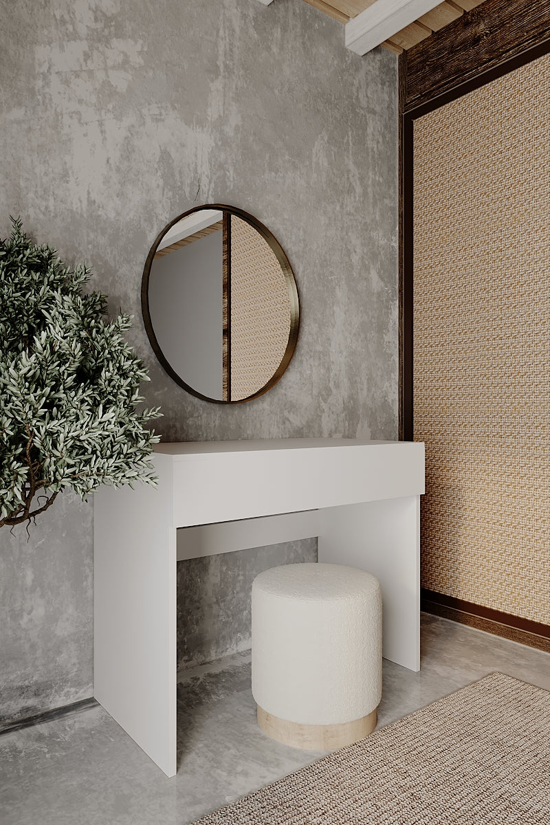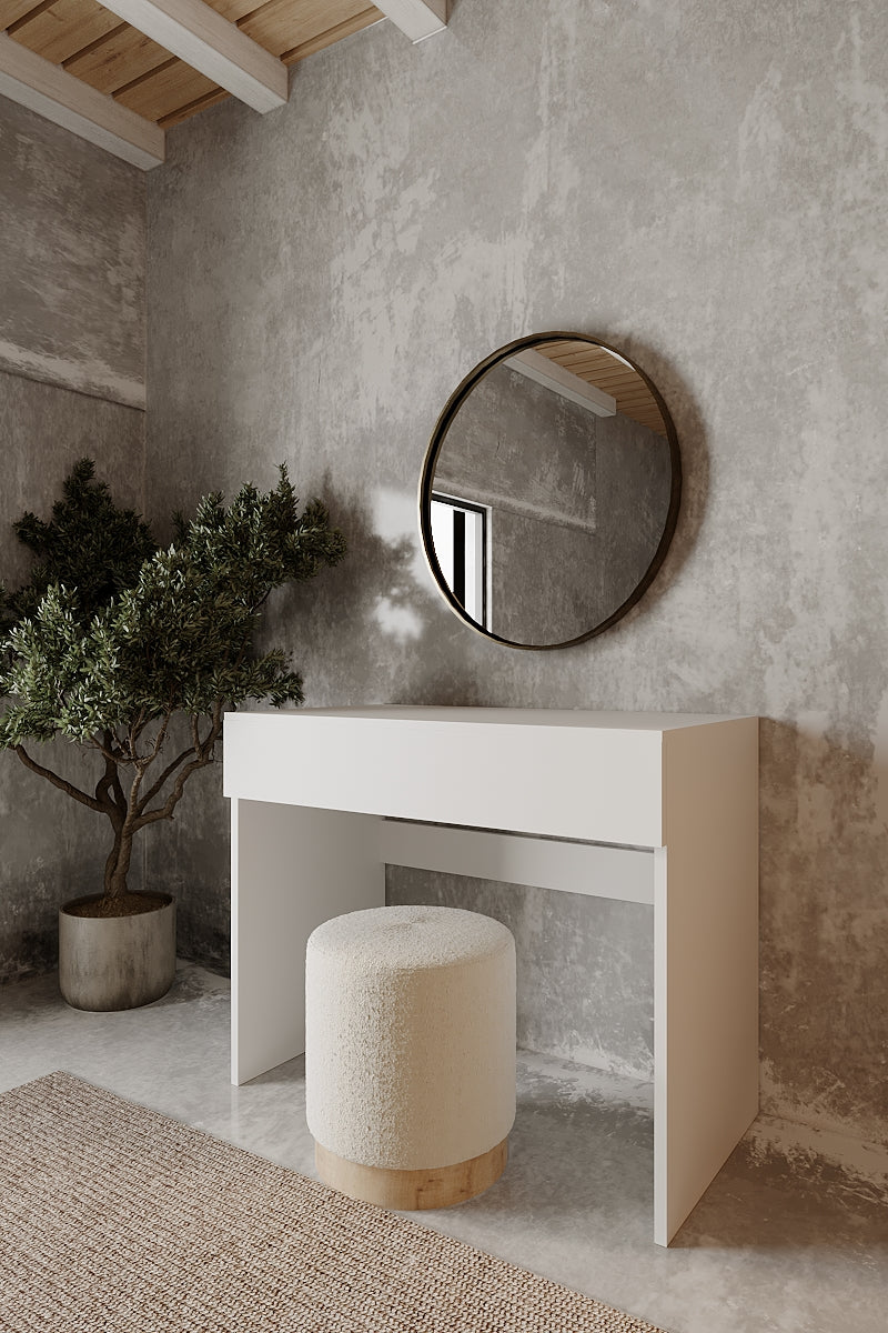 Modern çizgilerle tasarlanan beyaz parlak makyaj masası, minimalist tarzı ve işlevsel yapısıyla dikkat çeker.